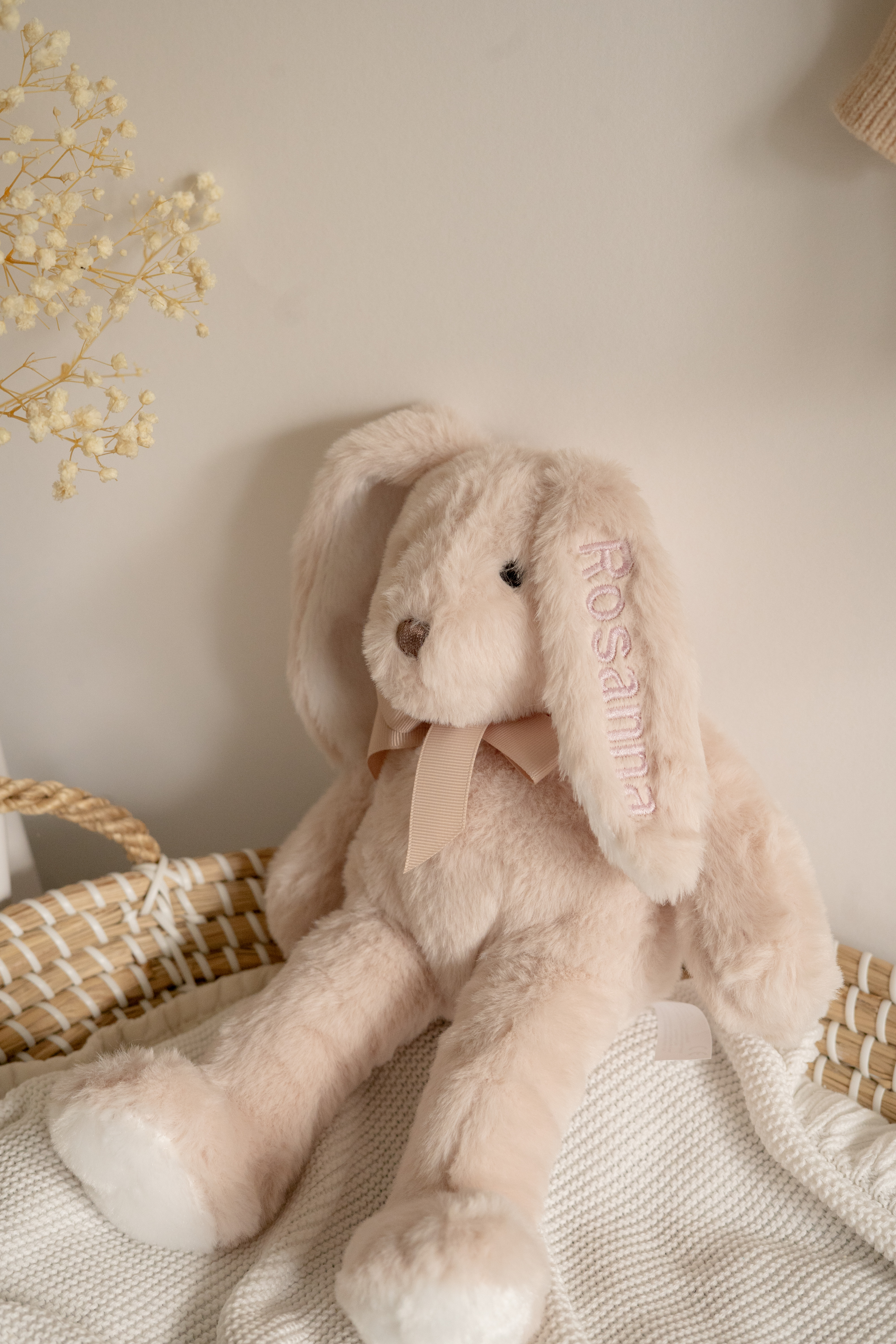 Armas ja pehme kaisujänes, mis on ideaalne kingitus beebile või suuremale lapsele. See personaliseeritud kaisukas sobib hästi katsikukingiks, sünnipäevakingiks või beebi esimeseks kalliks kaaslaseks.