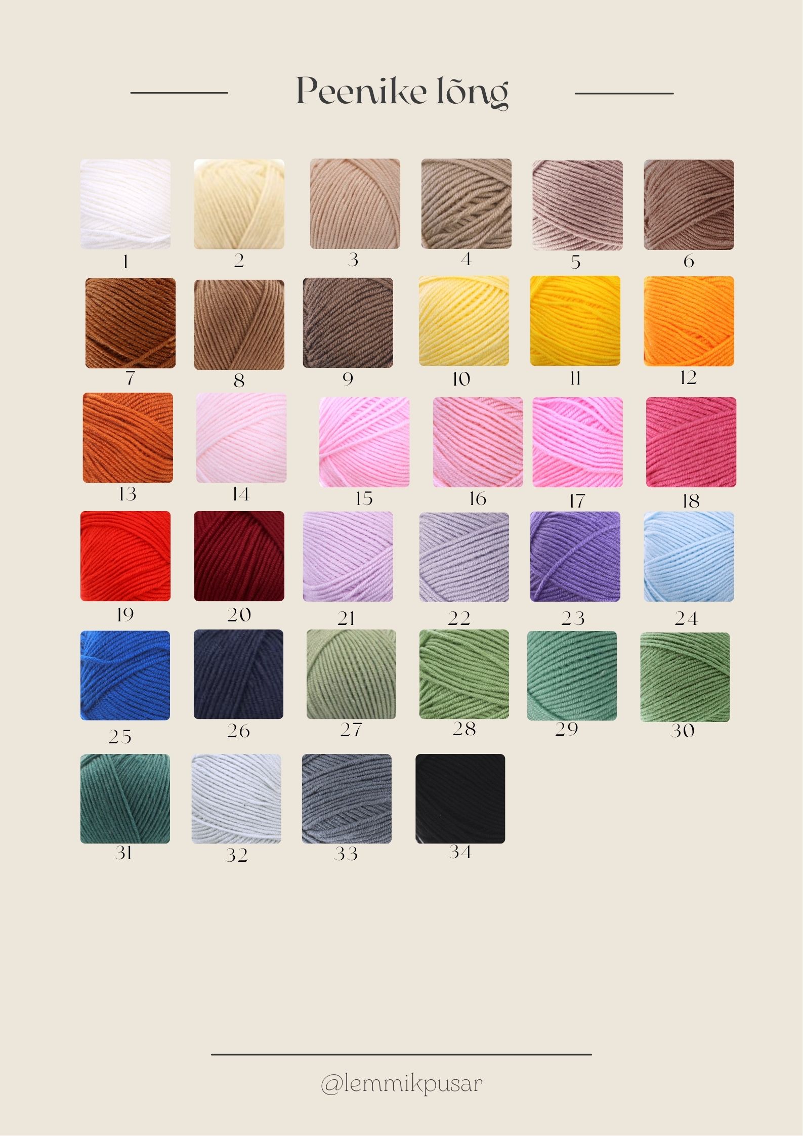 Lõngasid on meil igas toonis. Kui Sa pole päris kindel, millist tooni valida või soovite täpsustavalt näha mingeid konkreetseid toone, võta meiega ühendust! Saadame Sulle soovitud toonidest pildid ja aitame valida sobivaima tooni!