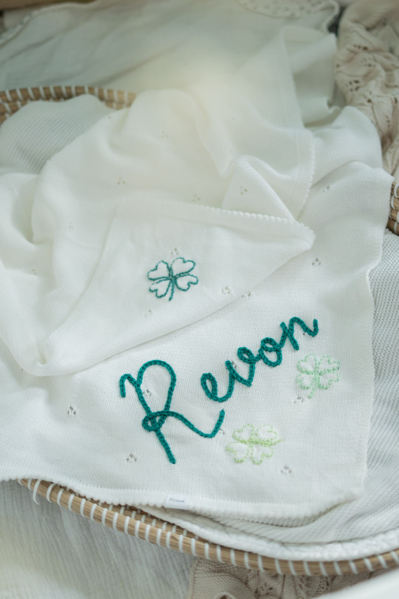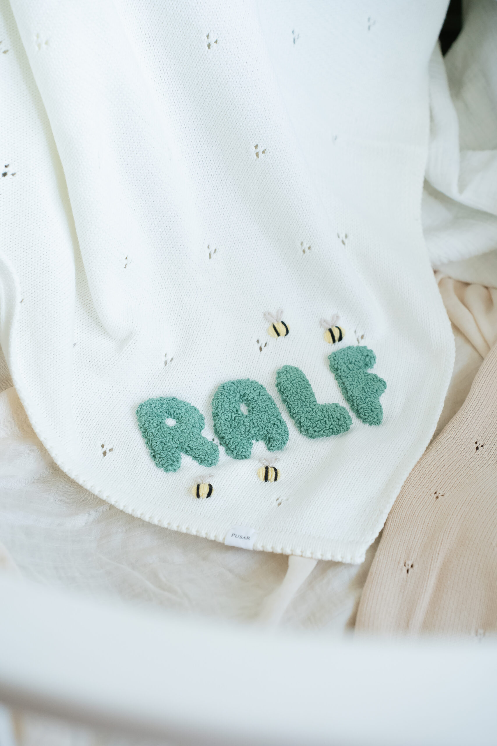Praktiline ja armas piiskadega tekk, mille peale on käsitsi tikitud lapse nimi.